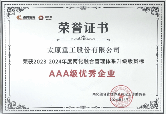 近日,太原重工股份有限公司成功獲評(píng)2023-2024年度兩化融合管理體系升級(jí)貫標(biāo)AAA級(jí)優(yōu)秀企業(yè),成為山西裝備制造業(yè)首家被工業(yè)和信息化部認(rèn)可的國(guó)家兩化融合管理體系A(chǔ)AA級(jí)的企業(yè),標(biāo)志著公司成為行業(yè)前列的兩化融合管理示范企業(yè)。