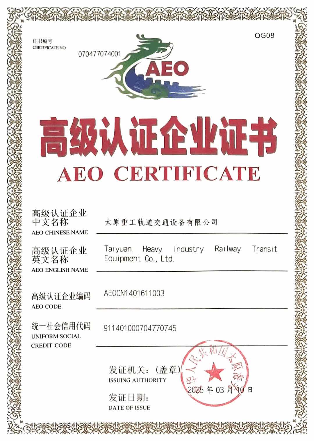 自此,太重軌道公司能夠享受優(yōu)先通關(guān)、降低查驗率、簡化單證審核等便利化措施,進一步縮短貨物通關(guān)時間、大幅提升通關(guān)效率,對降低通關(guān)成本、提升用戶滿意度具有積極意義。這一認證將有助于公司進軍高端國際市場,特別是在供應鏈安全標準嚴格的國家和地區(qū),為業(yè)務開展提供有力支撐。